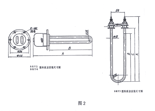 SRY2、SRY3型管状电加热器用于敞开或封闭式油槽中加热油用。SRY4型管状电加热器用于加热流动或循环的油。